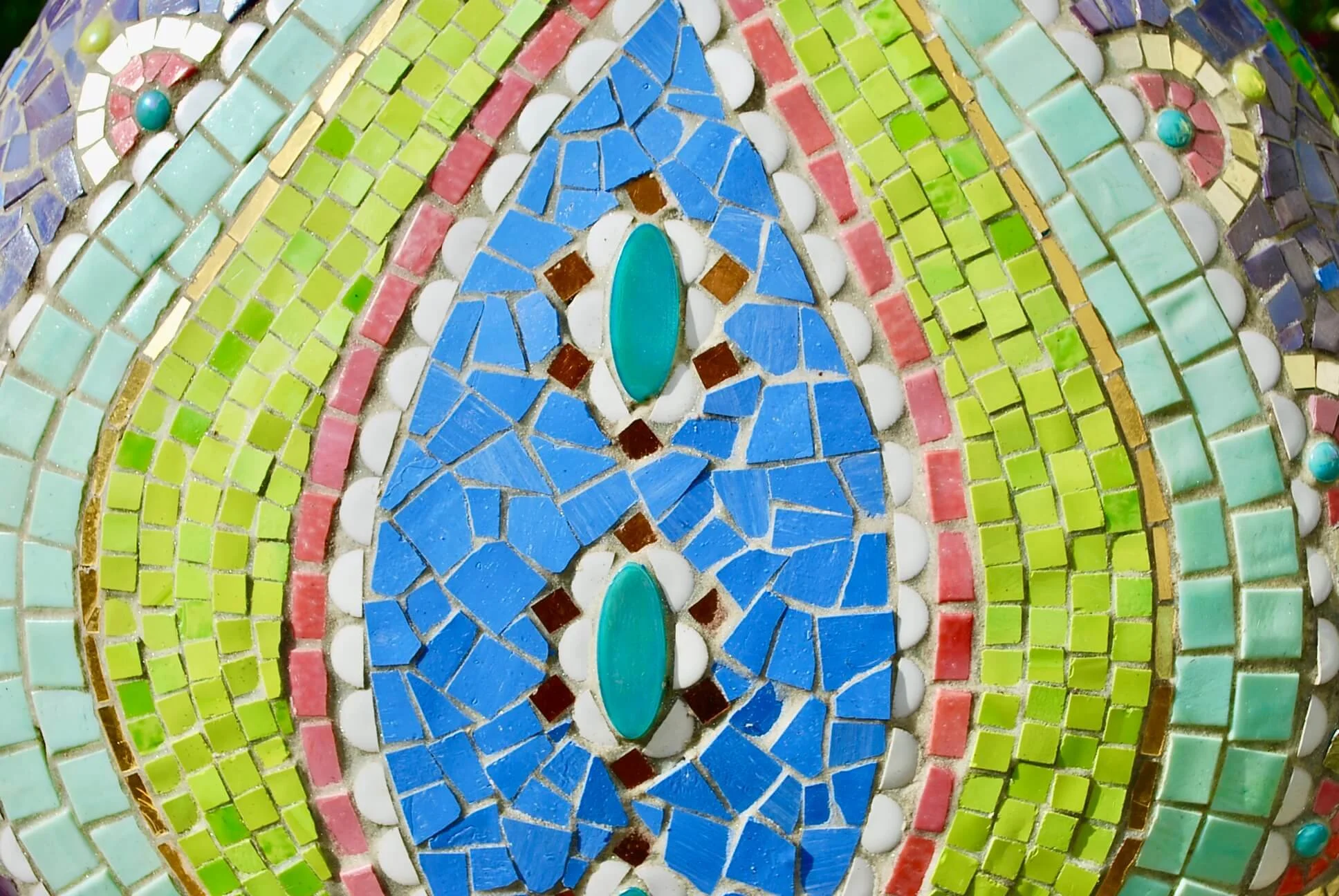 Materials: Vitreous glass and smalti glass mosaic combined with glazed ceramic beads and Venetian gold. Glitter grout.